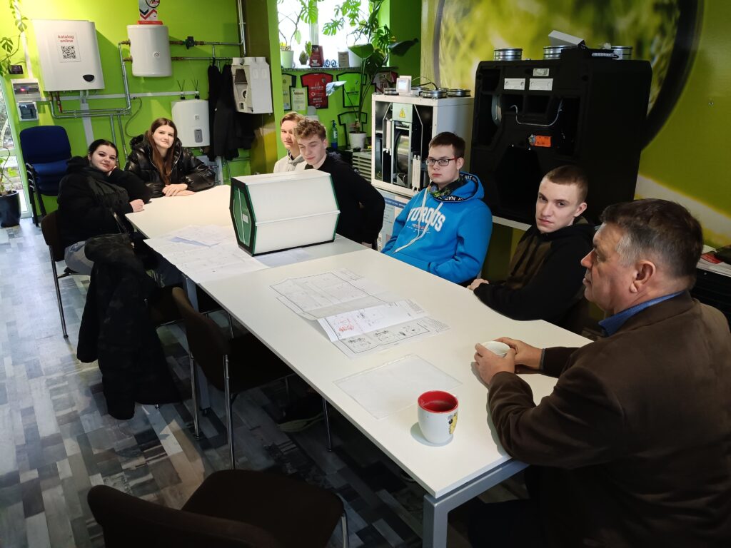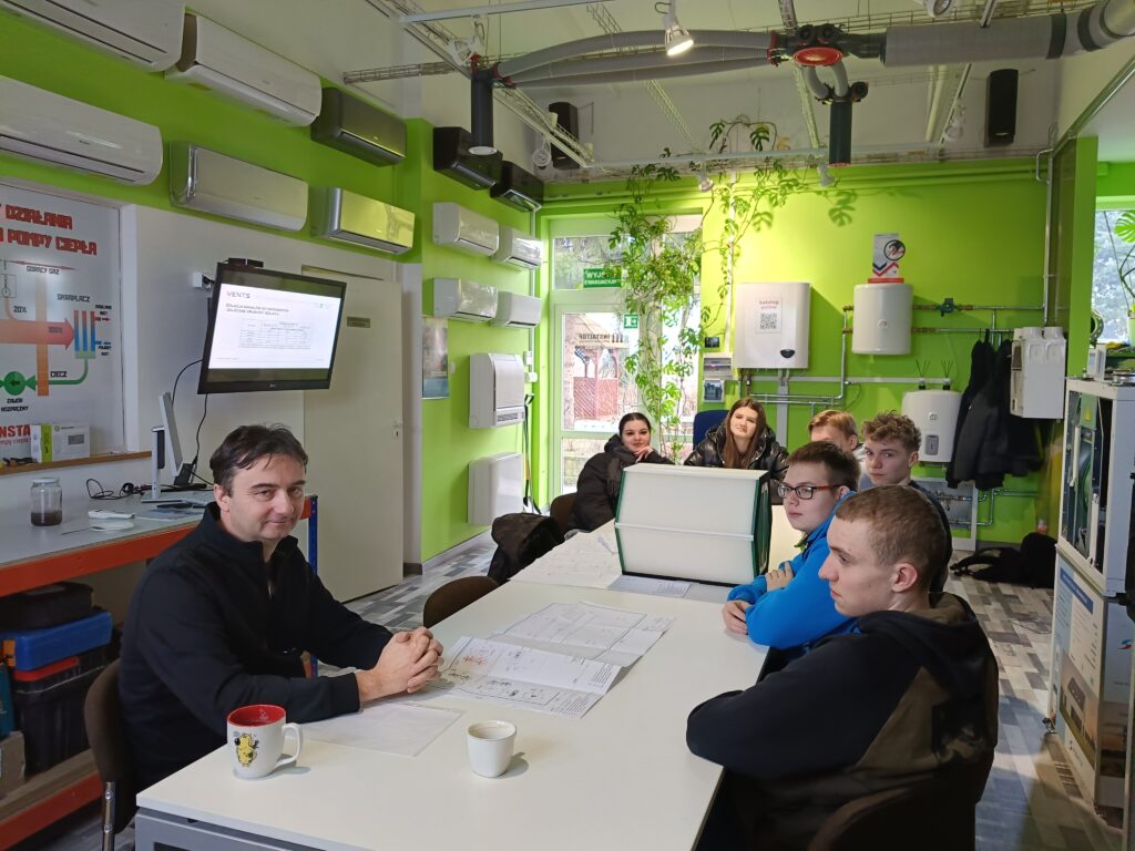 Właściciel przedsiębiorstwa, Paweł Piwoński, zaprezentował młodzieży aktualne wymogi dotyczące projektowania instalacji. Przyszli fachowcy analizowali proces doboru urządzeń oraz zasady montażu pomp ciepła, nowoczesnej klimatyzacji oraz systemów rekuperacji budynkowej.