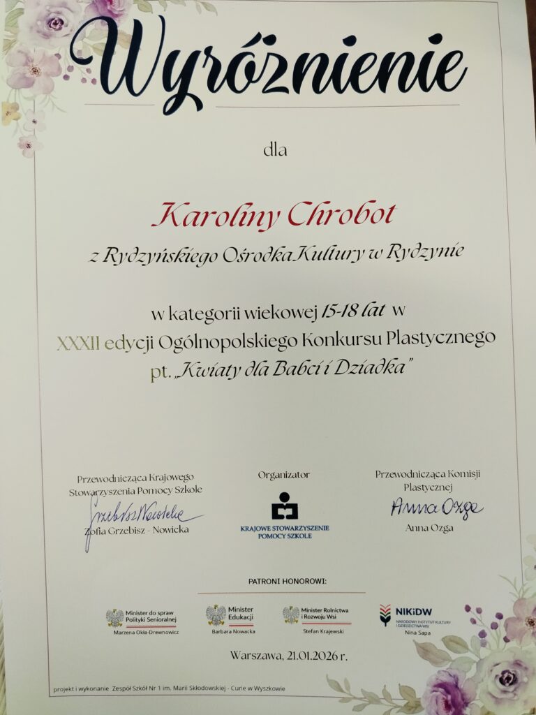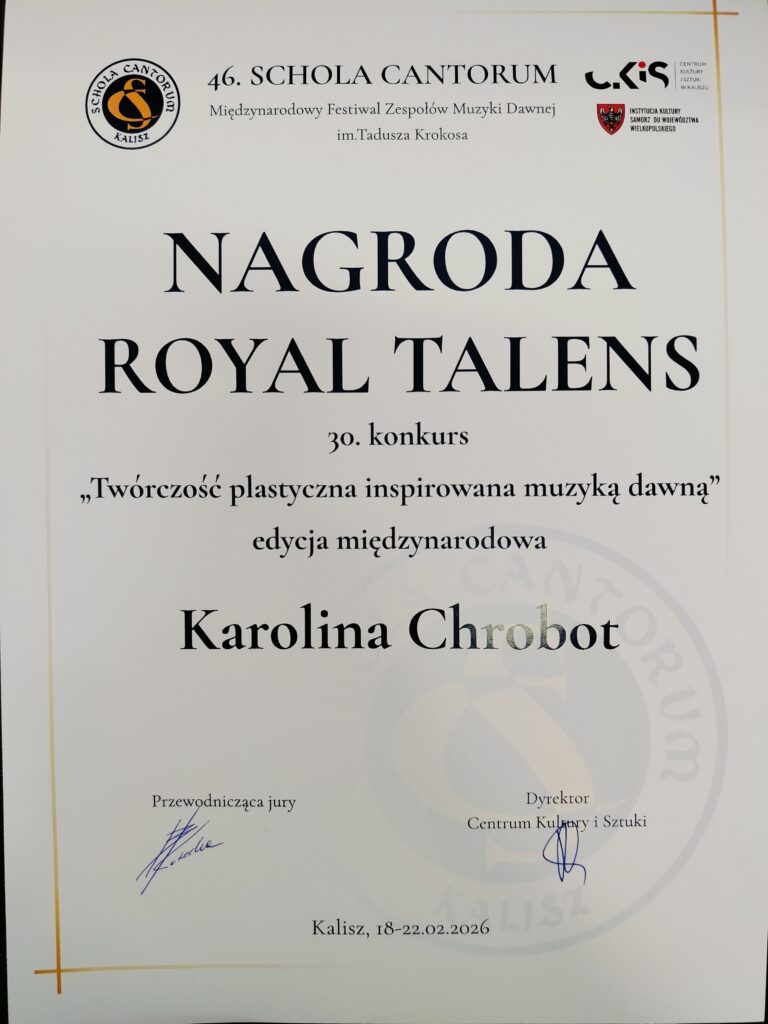 W ostatnim czasie Karolina wzięła udział w dwóch konkursach plastycznych: „Kwiaty dla Babci i Dziadka” oraz „Twórczość plastyczna inspirowana muzyką dawną”. Jej zaangażowanie i talent zostały docenione – uczennica otrzymała wyróżnienie, a jej praca znalazła się również na okładce katalogu konkursowego, za co przyznano Nagrodę Royal Talens.