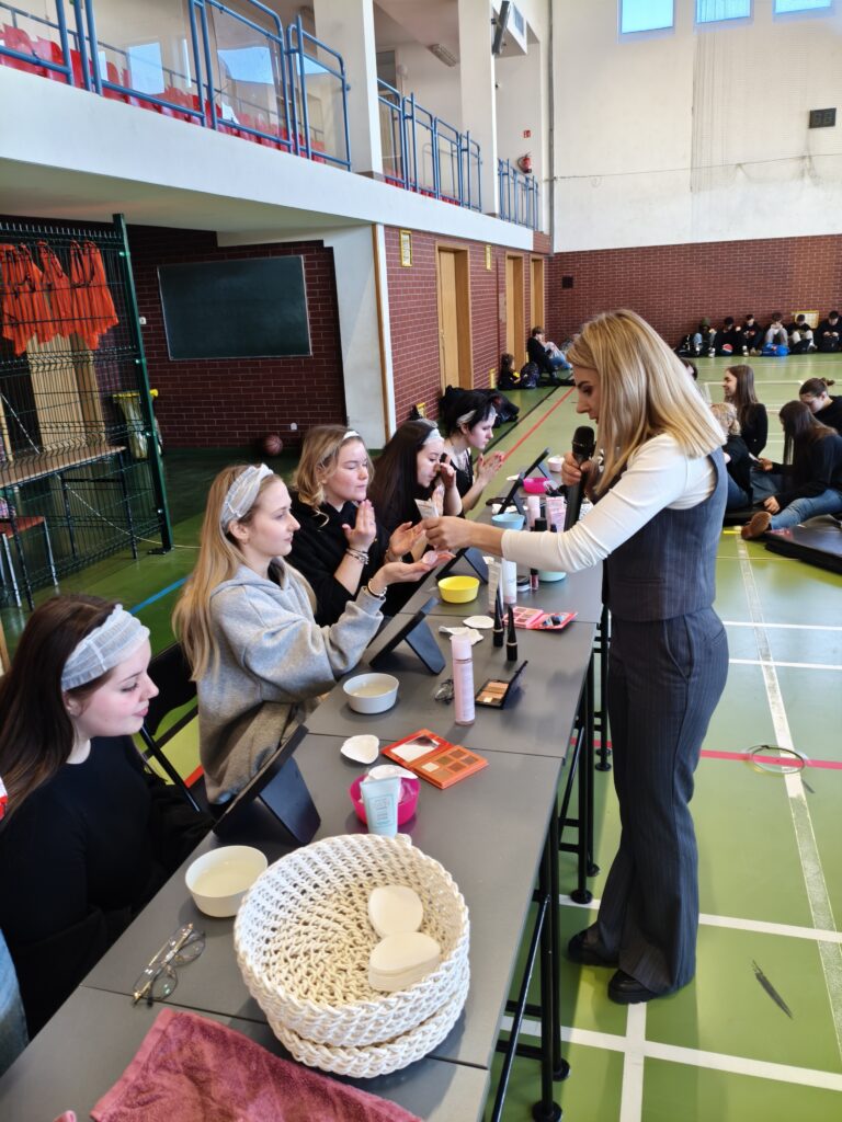 Chętne uczennice – oraz inne uczestniczki spotkania – miały również możliwość wykonania krok po kroku subtelnego makijażu dziennego. Nie zabrakło także chwili na pielęgnację dłoni i ust oraz rozmowy o najczęstszych błędach popełnianych podczas dbania o cerę.
