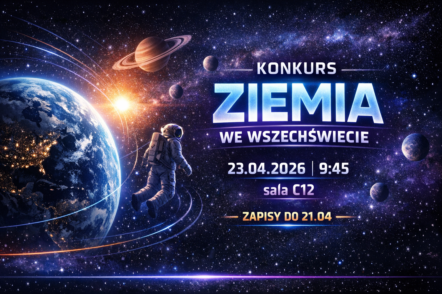 Konkurs odbędzie się 23 kwietnia 2026 roku o godzinie 9:45 w sali C12 i potrwa 60 minut. Uczestnicy zmierzą się z zadaniami obejmującymi zagadnienia związane z ruchem obrotowym i obiegowym Ziemi, budową Układu Słonecznego, teoriami powstania Wszechświata, ewolucją gwiazd, a także wyprawami kosmicznymi. W zakresie materiału znajdą się również zadania obliczeniowe, m.in. dotyczące czasu strefowego, czasu słonecznego oraz wysokości Słońca nad horyzontem.