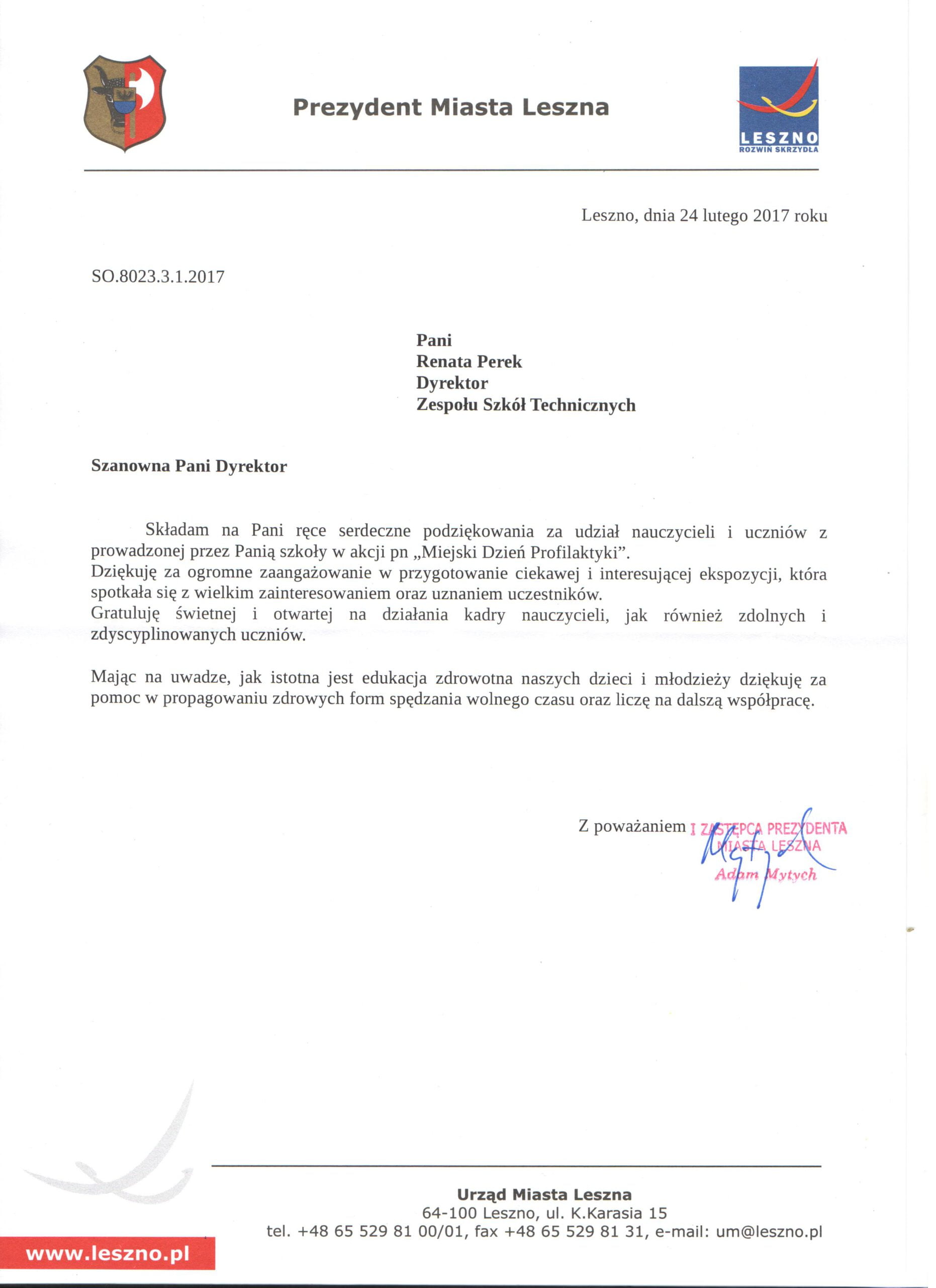 Szanowna Pani Dyrektor, składam na Pani ręce serdeczne podziękowania za udział nauczycieli i uczniów z prowadzonej przez Panią szkoły w akcji pn „Miejski Dzień Profilaktyki”.