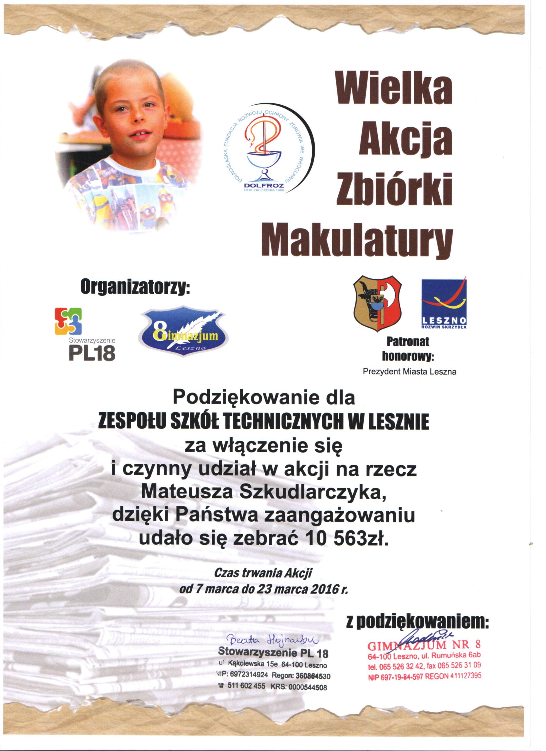 Podziękowania dla Zespołu Szkół Technicznych w Lesznie za włączenie się i czynny udział w akcji na rzecz Mateusza Szkudlarczyka, dzięki Państwa zaangażowaniu udało się zebrać