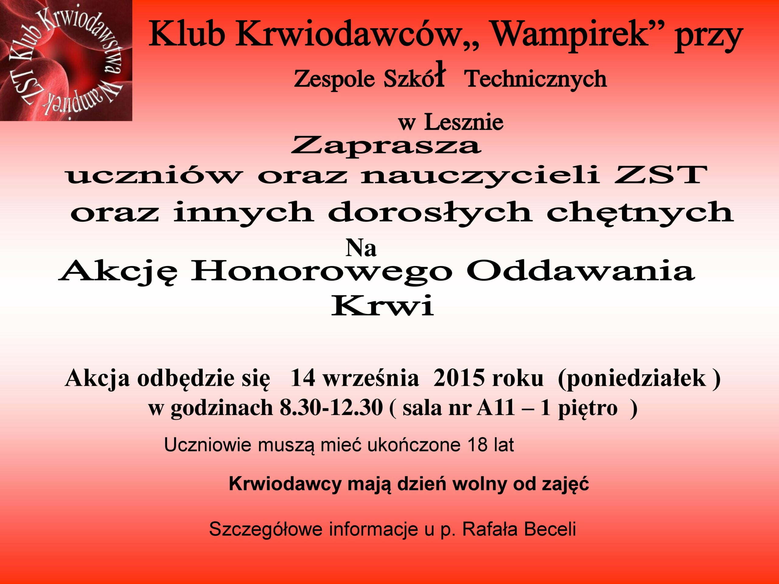 14 września 2015 roku w Zespole Szkół Technicznych czyli popularnym „KONIORZE” odbyła się akcja krwiodawstwa. Akcja została zorganizowana przez szkolny klub krwiodawców „Wampirek” z jego