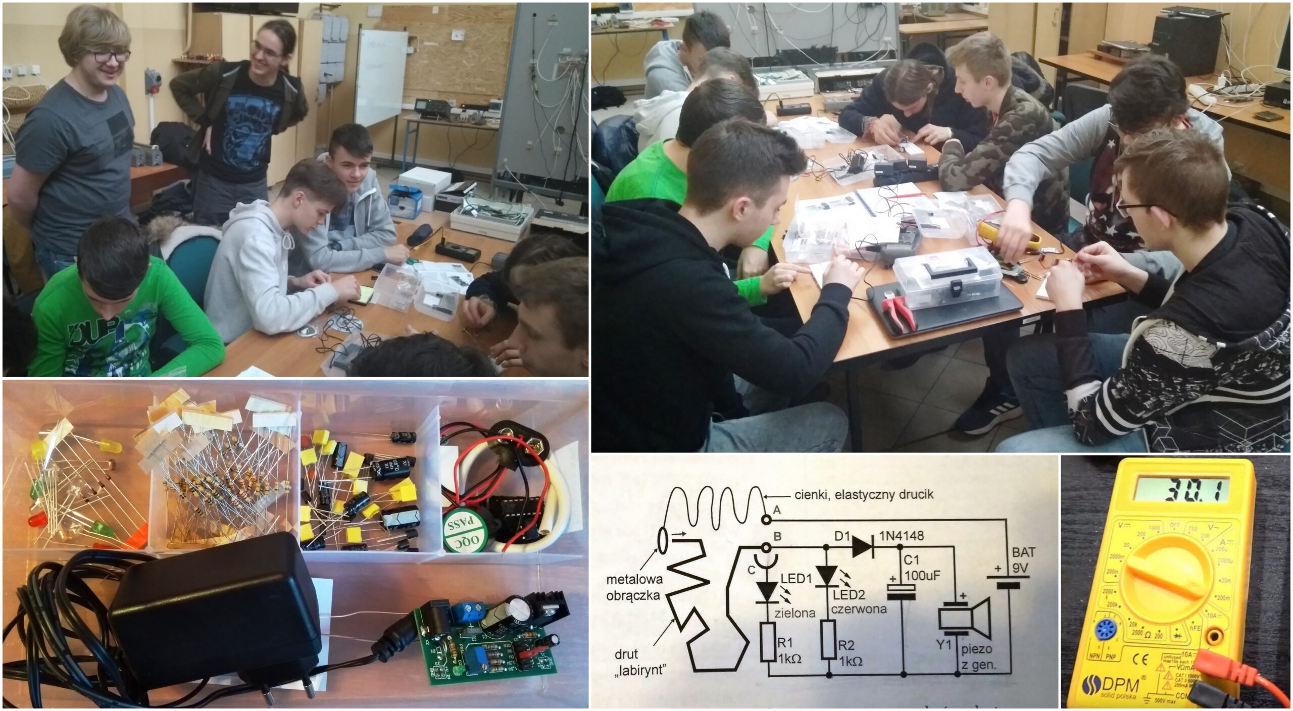 Uczniowie klas pierwszych w poniedziałki spotykają się na zajęciach Klubu Młodego Odkrywcy. Pod okiem starszych kolegów i nauczyciela prowadzącego bazując na schemacie elektronicznym montują układy,